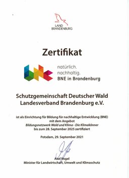 Die Waldpädagogik hat weiterhin einen großen Stellenwert in der Arbeit unseres Landesverbandes. Nun sind wir auch offiziell zertifiziert! Das gesamte Team der SDW Brandenburg freut sich sehr über diese hohe Anerkennung ihrer Bildungsarbeit. Mit der kostenlosen „BNE-Zertifizierung“ soll die Qualität von Bildung für nachhaltige Entwicklung (BNE) in der außerschulischen Bildung verbessert und transparent gestaltet werden. Der Zertifizierungs- und Qualitätsprozess wird von der „Servicestelle BNE Brandenburg“ begleitet. Als außerschulischer Bildungsakteur nutzte unser Landesverband im Rahmen dieses Prozesses die Möglichkeit, die eigene Bildungsarbeit entlang der strengen Qualitätskriterien zu reflektieren und weiterzuentwickeln - und damit gemeinsam einen großen Schritt nach vorn zu machen!